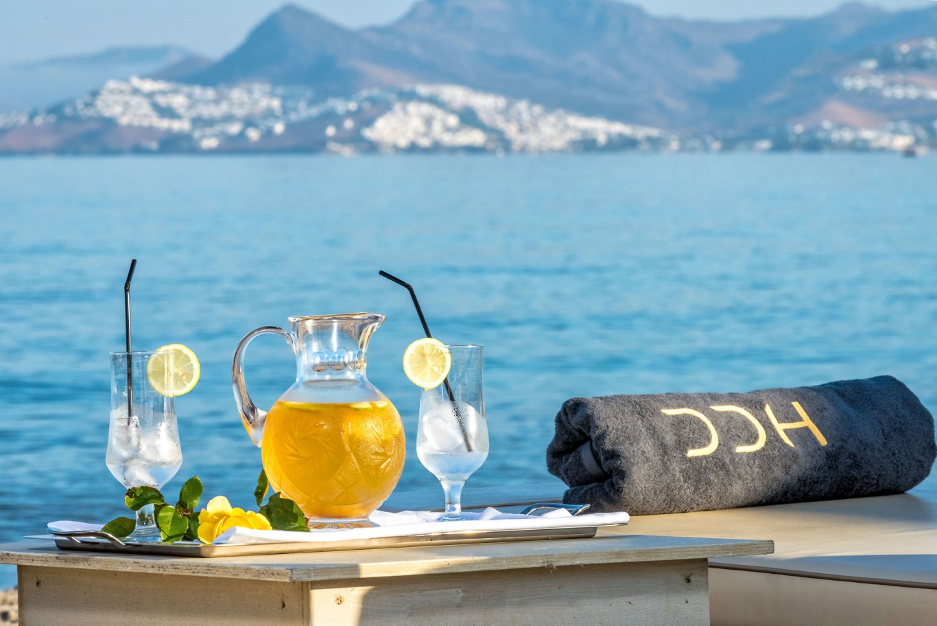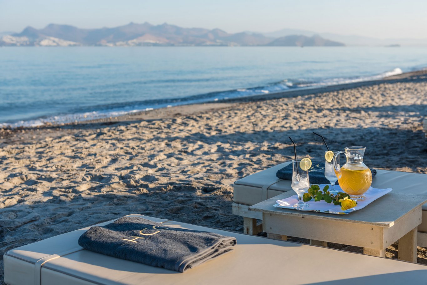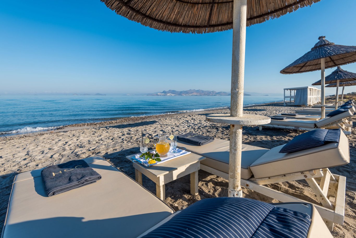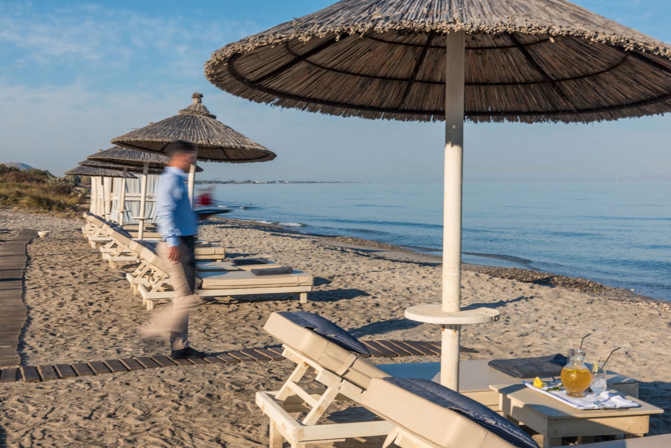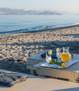 Under the comfort and shade of immaculate white umbrellas and sun beds, enjoy the extensive range of refreshments and light dishes.