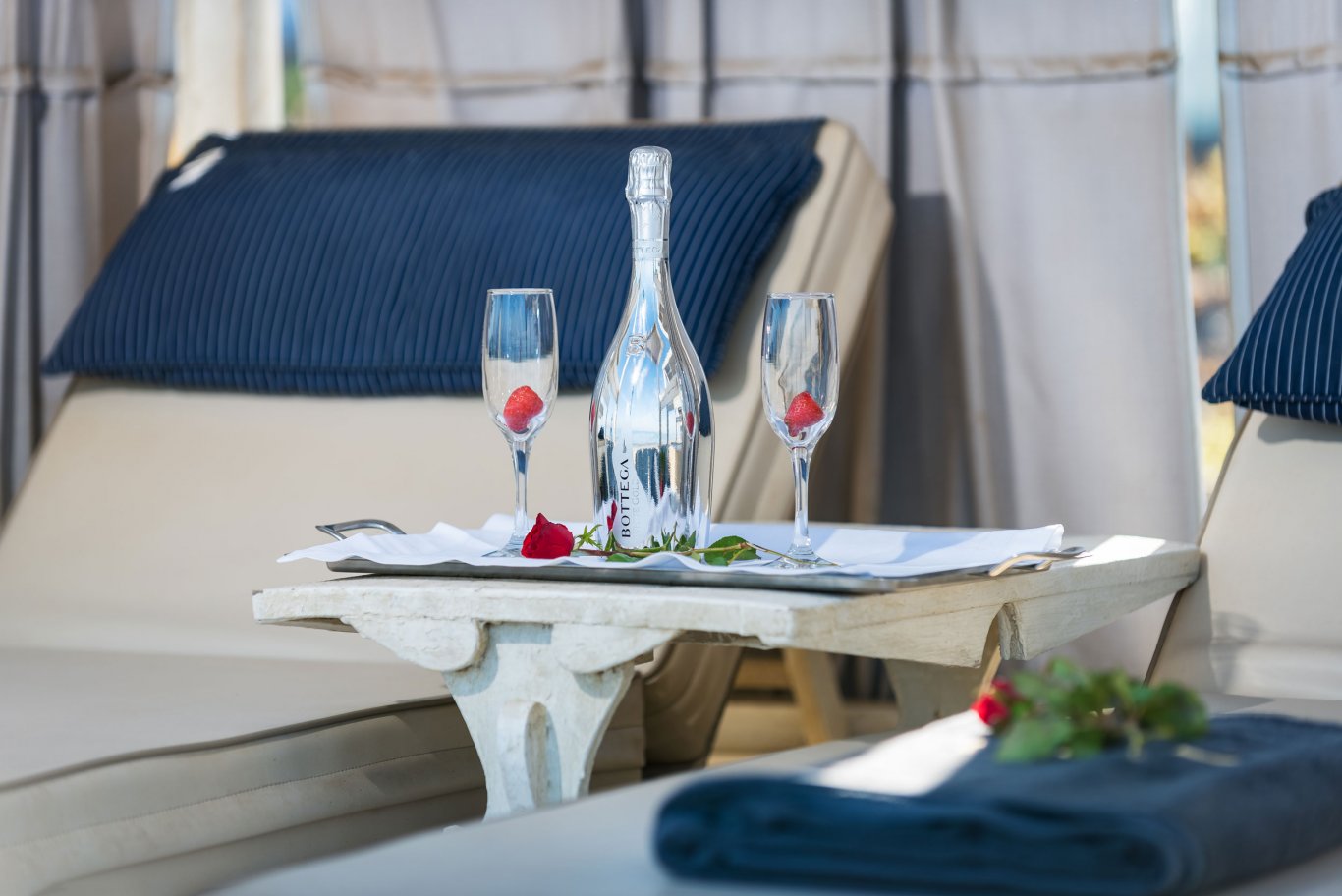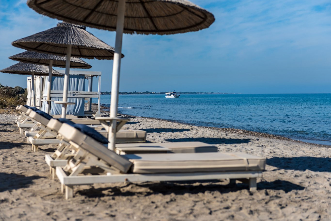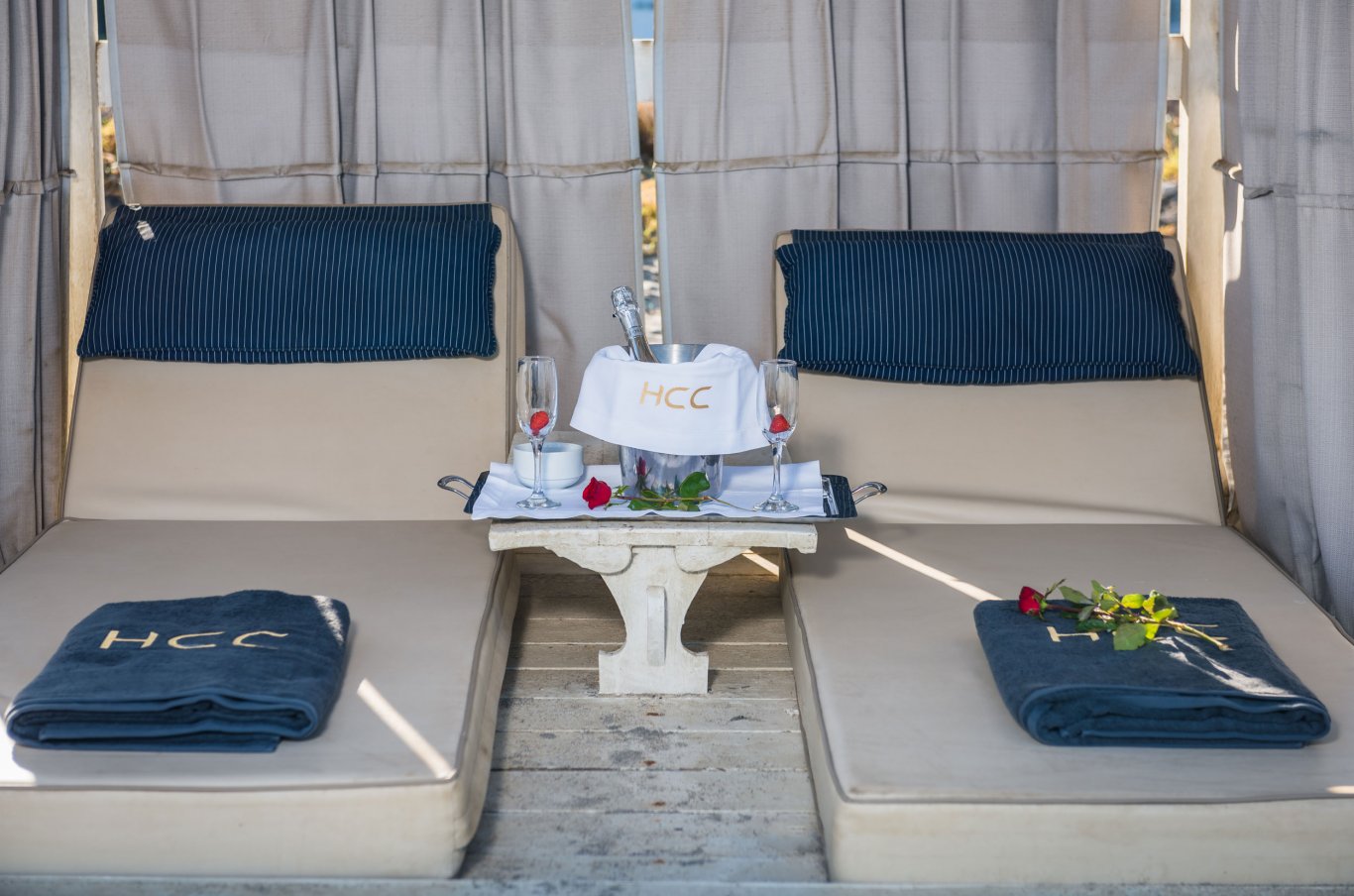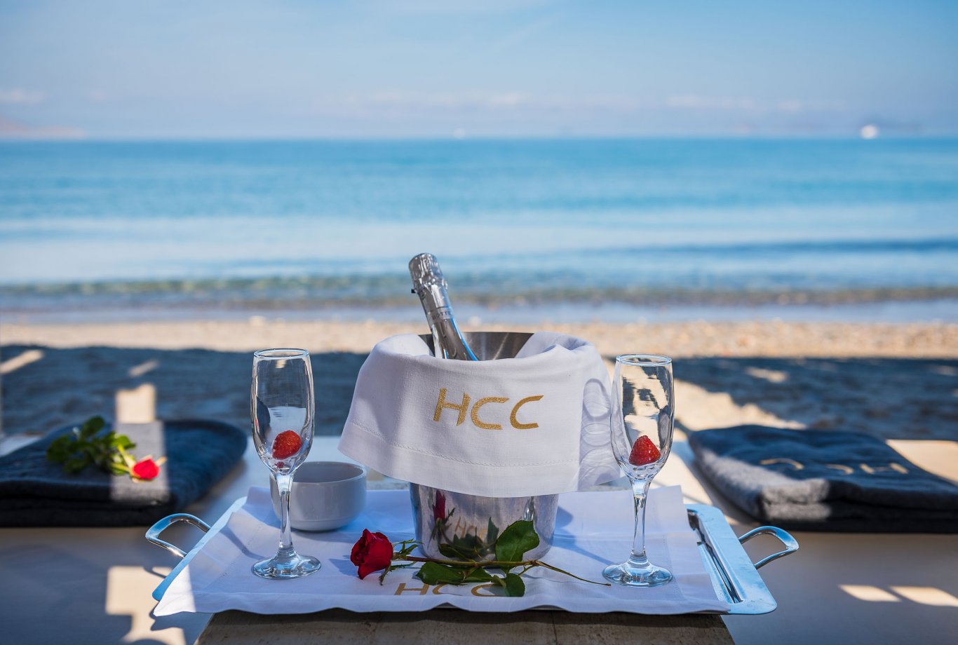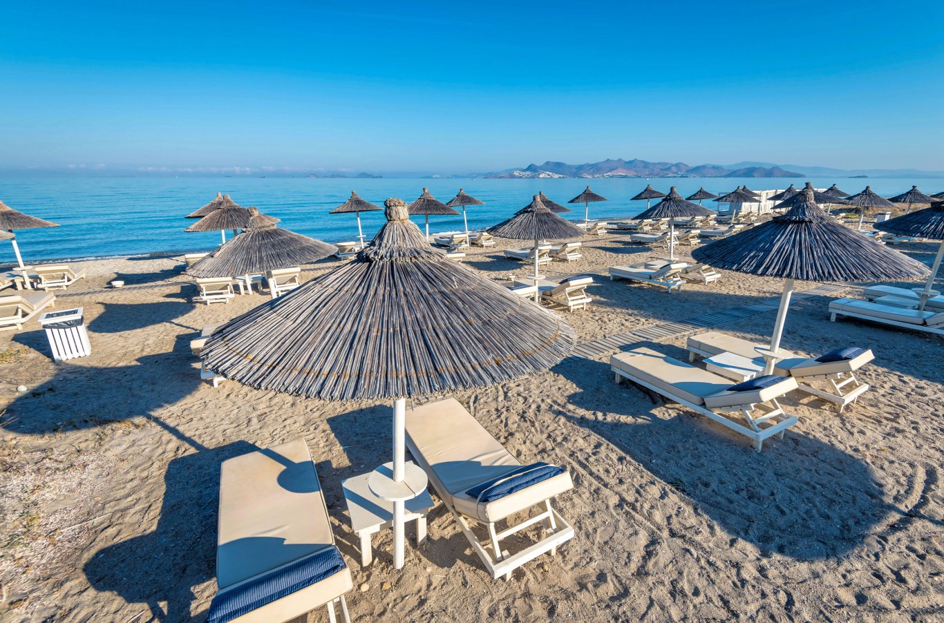 Under the comfort and shade of immaculate white umbrellas and sun beds, enjoy the extensive range of refreshments and light dishes.